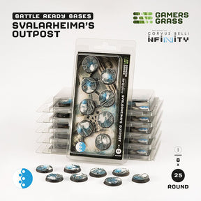 • This pack contains 8 round Battle Ready Bases 25mm wide in a Svalarheima’s Outpost theme.
