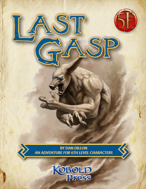 Last Gasp is an adventure set in the Southlands Campaign Setting, exploring the cursed tomb of an ancient king of great magical power, a magical river, and including both deadly combats and mysteries to confound tomb-robbers. It is designed for five or six 6th-level characters using the 5th Edition rules and includes two entirely new monsters, the rotting wind and the anubian, presented with complete 5th Edition stats.