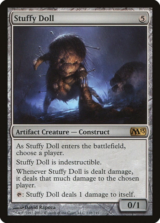 • Rules Text Contains: As Stuffy Doll enters the battlefield, choose a player. <br> Stuffy Doll is indestructible. <br> Whenever Stuffy Doll is dealt damage, it deals that much damage to the chosen player. <br> T: Stuffy Doll deals 1 damage to itself.