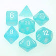 7-Die Set Frost: Teal/White. Includes: 4-sided, 6-sided, 8-sided, 10-sided, percentile, 12-sided, and 20-sided gaming die