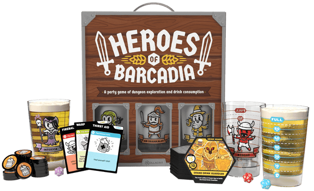 Heroes of Barcadia is a 2-6 player tile-based, dungeon-crawling tabletop party game with a liquid twist: your character’s health is measured by the drink in your glass.