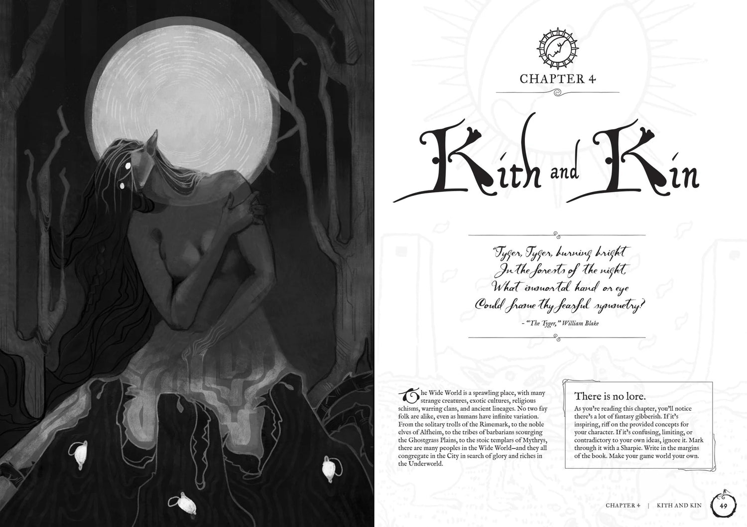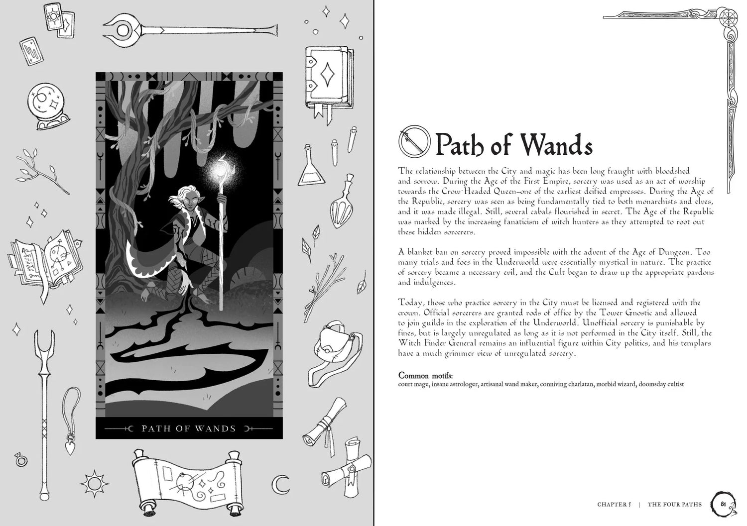 The game is intended for a traditional setup between a single GM and 3-6 players. It emphasizes long-term, Metroidvania-like play. The book is 404 pages long, split up over 10 chapters and 5 appendices. The print edition is silver foil stamped and has a ribbon bookmark. The digital edition is thoroughly cross-linked, with a robust index. It is a complete game with everything you need in one tome (just add a tarot deck).
