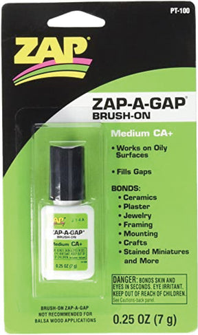 ZAP-A-GAP CA+ Is the best selling instant glue in the world. The ability to bond virtually anything to anything with consistency unequalled by any other brand makes it the favorite adhesive across many varied disciplines. Widely used throughout the hobby industry, it is the absolute best and most consistent performing glue for model building and crafting. Some uses besides hobbies and crafts include; jewelry manufacturing and repair, taxidermy, pool cue tips, darts, archery, knife making, mold and pattern making, furniture refinishing and antique repair, auto detailing, dental molds and patterns, ceramic repair, and for fishing, fly line splicing and fly tying. For manufacturing, ZAP-A-GAP CA+ will bond metal and / / or plastic materials allows for fast simple positioning of parts for assembly or machining. Wood turners and manufacturers of custom wood products appreciate the ability of ZAP-A-GAP CA+ to help "save" their projects by filling in and bonding cracks that often occur in expensive hard woods. Wood, plastic, metal, glass, ceramic, fabric, rubber, fiberglass, carbon fiber, or any combination of, ZAP-A-GAP CA+ can help solve many tough bonding problems.Helpful Hints: